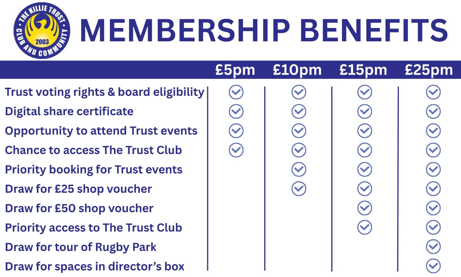 You can sign up to join The Killie Trust for either £5, £10, £15 or £25 per month. Each membership tier comes with additional benefits to reward loyal members and Kilmarnock fans, to give them the opportunity to be closer to the club than ever before.